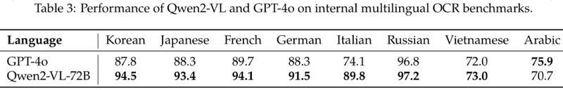 特にマルチリンガル OCR ベンチマークの結果として、Qwen2-VL が日本語にも比較的良く対応しており、日本語を扱う用途での利用が期待されます。