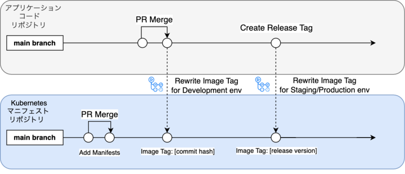 図5はブランチ戦略を簡単に表現した図です。 アプリケーションコードのリポジトリとK8sマニフェストのリポジトリ、どちらもmainブランチのみを利用しています。K8sマニフェストリポジトリ上では、通常のマニフェストの変更はPull requestを作成する運用になっています。アプリケーションのデプロイパイプラインではImage TagのみをGitHub Actionsで自動的に書き換えています。
