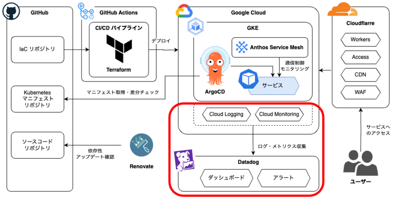 前回は、Google Cloudが提供するAnthos Service Meshを導入して、GKEで動くアプリケーションに可観測性やセキュリティなどの機能を追加する方法について紹介しました。今回はDatadog1を利用したモニタリング基盤について、Datadogの採用理由や基本機能、キャディでの活用事例を紹介します(図1)。