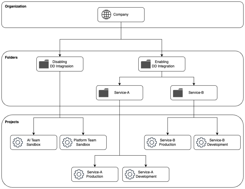 前述のように、DatadogとGoogle Cloudの連携作業はそれほど難しくありません。しかし、冒頭でも紹介したように、Google Cloud上に多くのプロジェクトを抱える組織では、これらの設定がトイルになってしまいます。また、設定漏れや誤りといった作業ミスも発生します。 キャディではこれらの課題を解決するために、Google CloudのResource Managerを活用しています。Resource Manager は、Google Cloudアカウント内のリソースの整理、階層化する機能で、筆者らはアクセスコントロールやコスト管理の向上に役立てています。 Resource Managerでは「組織」と「フォルダ」という単位でプロジェクトを管理できます。「組織」はGoogle Cloudアカウント全体を管理するトップレベルのエンティティです。組織には複数のプロジェクトやフォルダを含められます。 「フォルダ」は組織内でプロジェクトを管理するための階層的なエンティティです。フォルダ配下のプロジェクトに関して、アクセスコントロールポリシーや管理ポリシーを一元的に設定できます。 キャディでは、特定フォルダ配下のプロジェクトを自動検出するしくみを取り入れてDatadog導入の運用負荷を下げています。図3のようなフォルダ構成では、Enabling DD Integrationフォルダで連携設定するようにしており、このフォルダ配下に作成したプロジェクトではメトリクスが収集されるようにしています。一方、Disabling DD Integrationフォルダ配下のプロジェクトは対象外になります。